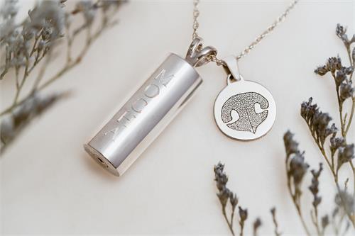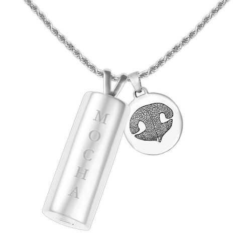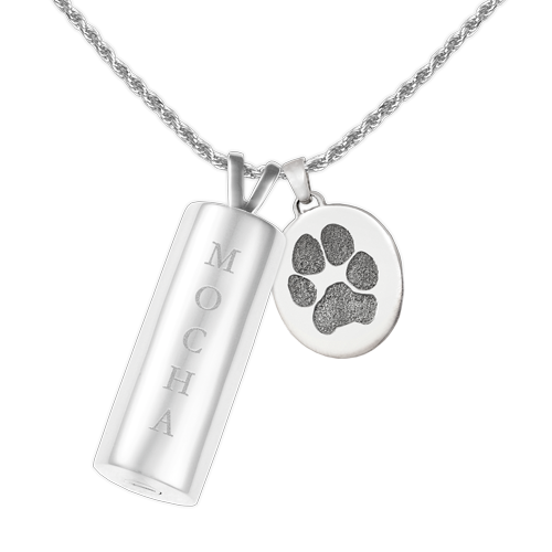 Celebrate your furry companion with this sweet pet personalized jewelry set. This thoughtfully curated collection includes a sterling cylinder pendant with name engraved, a petite charm personalized with your pet's actual nose or paw print and a sterling silver chain of your choice. The cylinder has a secret inner compartment to hold a tiny memorial and is sealed with a rubber gasket and threaded closure.