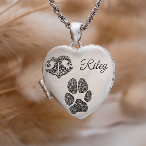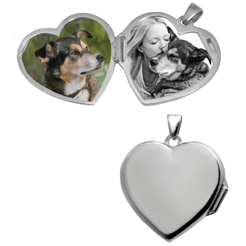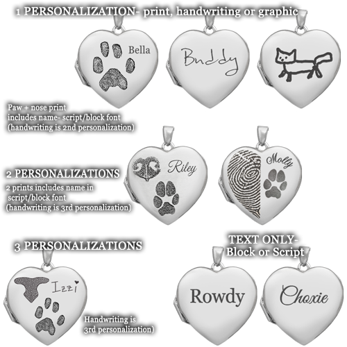 This popular heart pendant can be engraved with a paw or nose print, graphic- like a drawing, actual handwriting or text. Inside the locket may hold two small photos. These pendants make a special memorial to honor a furry companion. Photos not included.