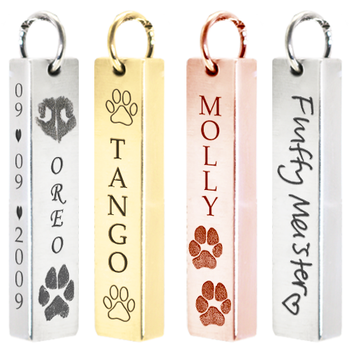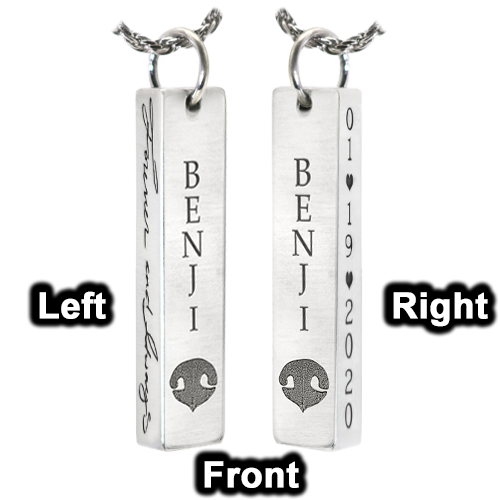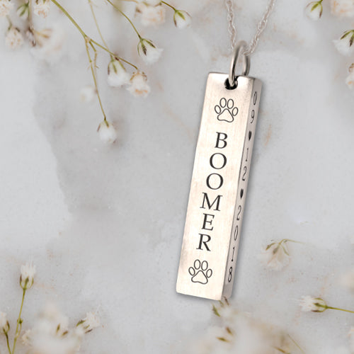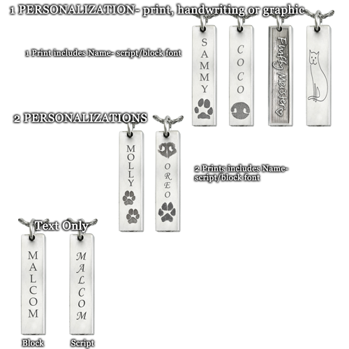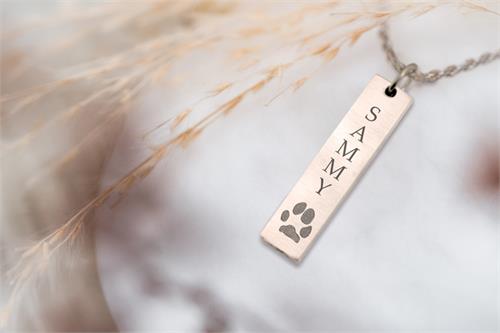 Personalize the front of this classic bar pendant with a pet's nose or paw print, a pet name handwritten or in script or block font, or a child's drawing of a furry friend.